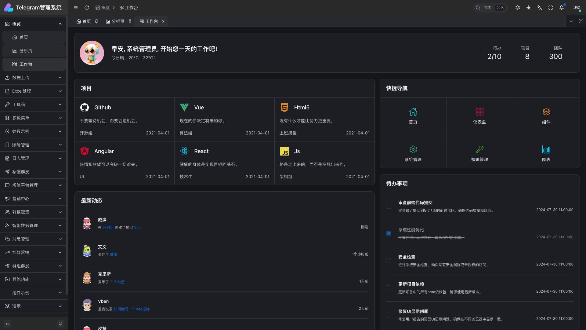 Full-stack web application for Telegram management - Frontend: Vue 3 + Vben Admin - Backend: NestJS - Features: User management, group broadcast, statistics 🤖 Generated with [Claude Code](https://claude.com/claude-code) Co-Authored-By: Claude <noreply@anthropic.com>